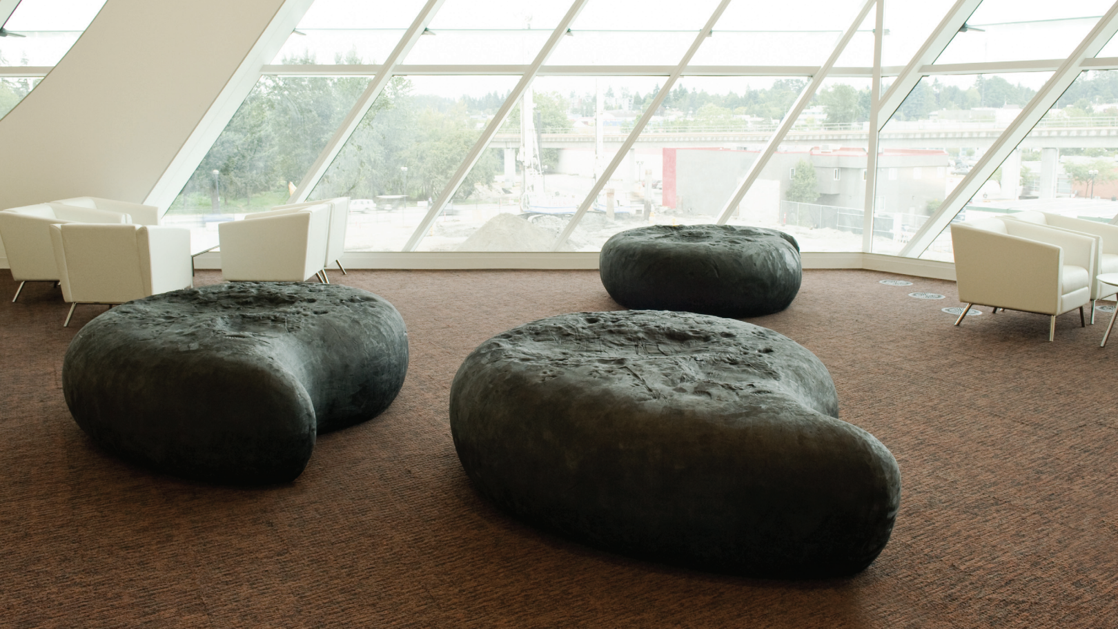 Installed on the third floor of City Centre Library, Marks is a group of four black silicone sculptures that resemble punctuation marks when viewed from above. At ground level, they appear abstract, inviting visitors to move among them and become part of the library’s narrative—a shared space for solitary acts like reading, studying, and reflection. Soft and warm to the touch, the sculptures bear subtle impressions of human bodies, symbolizing the diverse stories and presence of the community they represent.